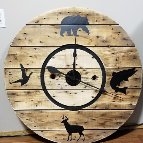 What better way to add a focal point to any room then a functional spool wall clock. These reclaimed clocks end life as an electrical cable spool and are now one of the hottest trends in decor. Each clock is custom made to your specs, available in our standard stains and colour with numbers, roman numerals or silhouettes. Other sized spools can be sourced.